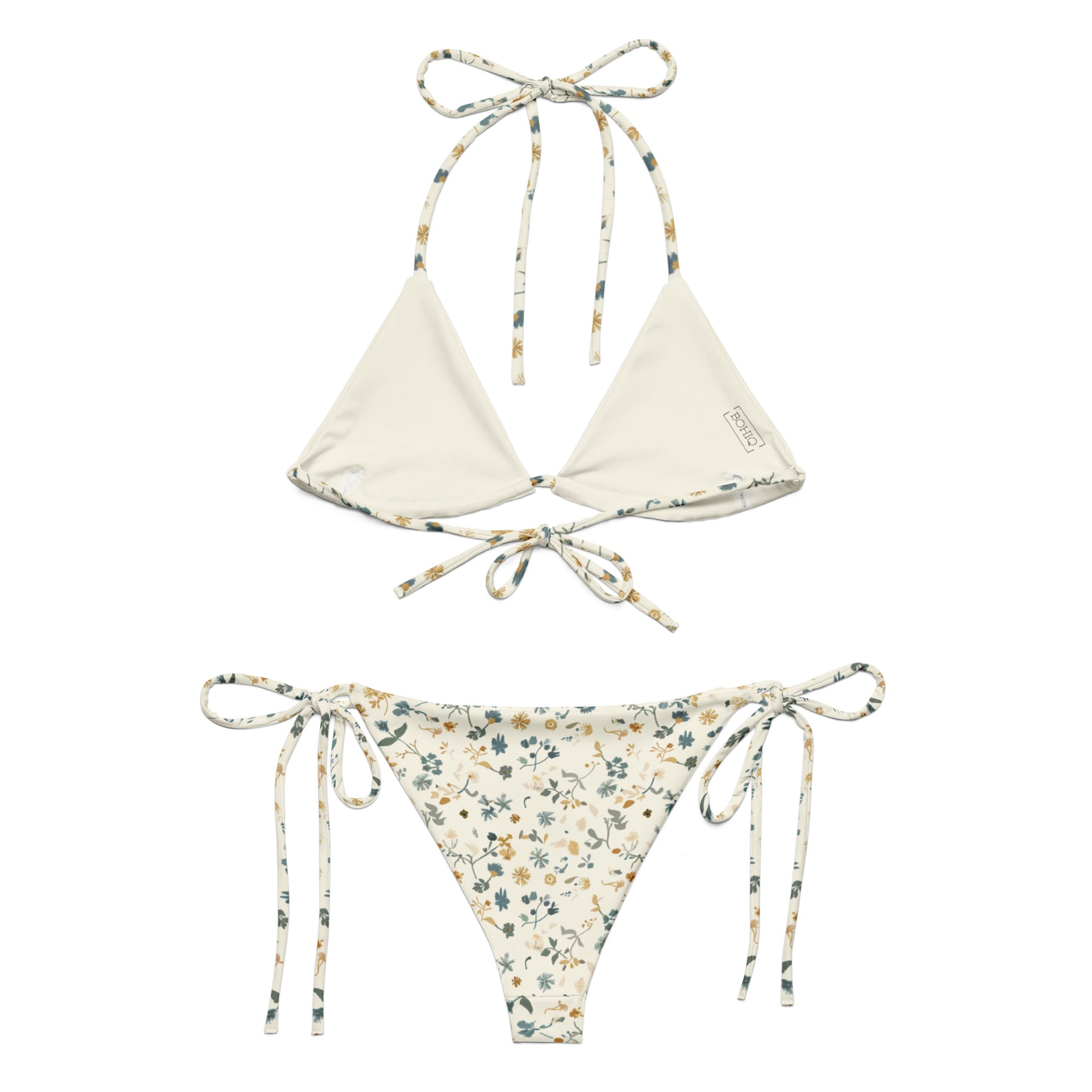 Fresh, soft, and effortlessly feminine, the Soft White Floral String Bikini Set features a floral print over a clean neutral white base for a timeless beach-ready look. This eco-friendly swimwear set includes a classic triangle bikini top with removable padding and adjustable ties, paired with tie-side bottoms for a flattering, customizable fit. Lightweight, comfortable, and designed for sun-soaked days, this floral bikini set blends elegant simplicity with sustainable materials.